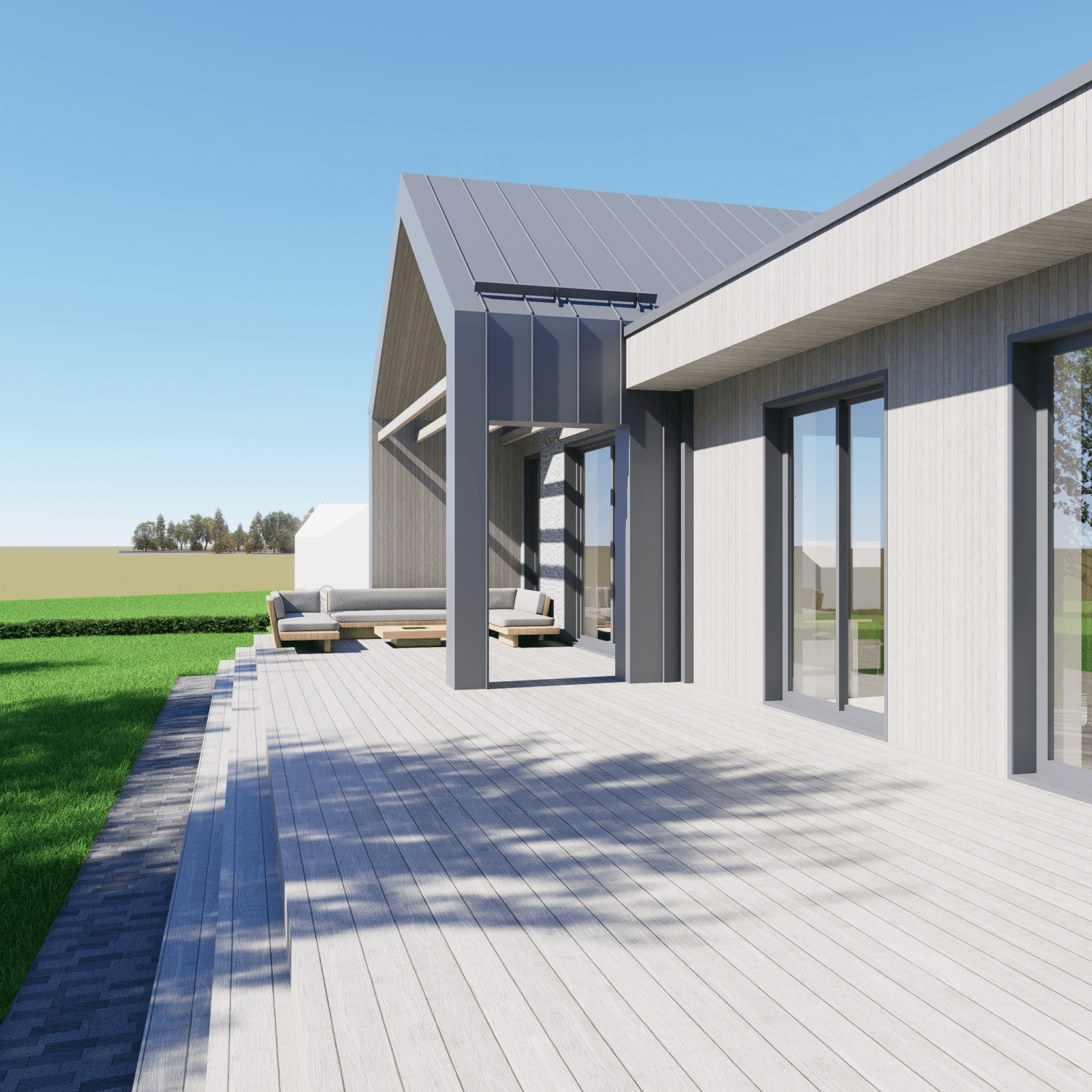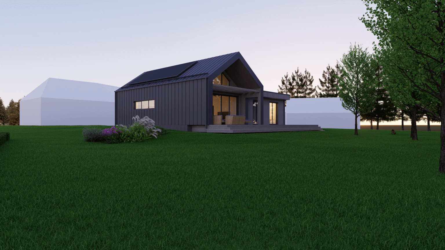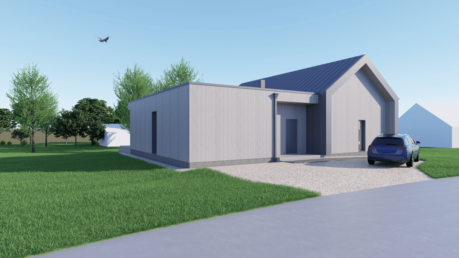 Hoone koosneb kõrge laega viilkatusega põhimahust, mis katab avatud elutoa koos köögiga, märjad ruumid (dušširuum ja saun) ning sahvri.Hoone põhimahtu toob esile lamekatusega maht, kus paiknevad magamistoad ja tehnoruum. Hoovi on projekteeritud suur terrass, kus saab vabal hetkel hinge tõmmata või suuremat seltskonda vastu võtta.