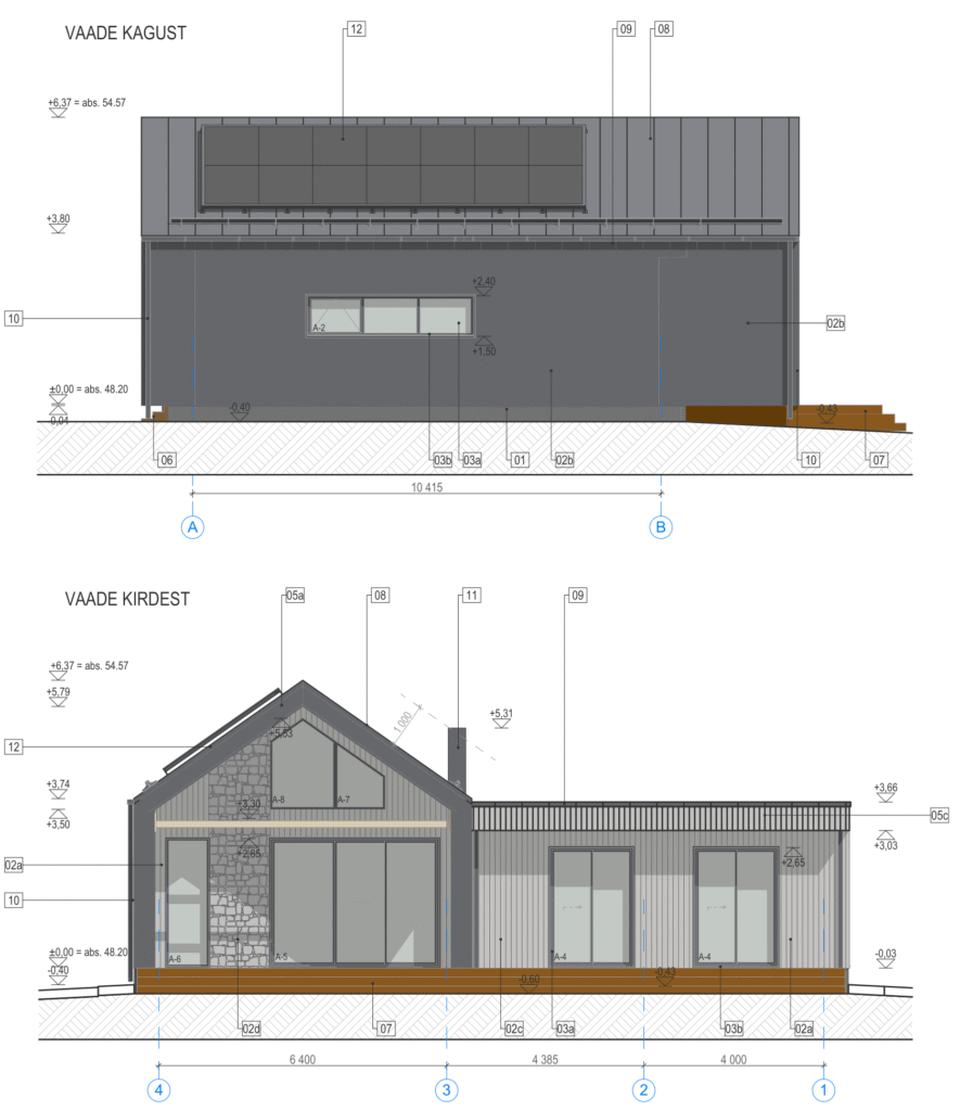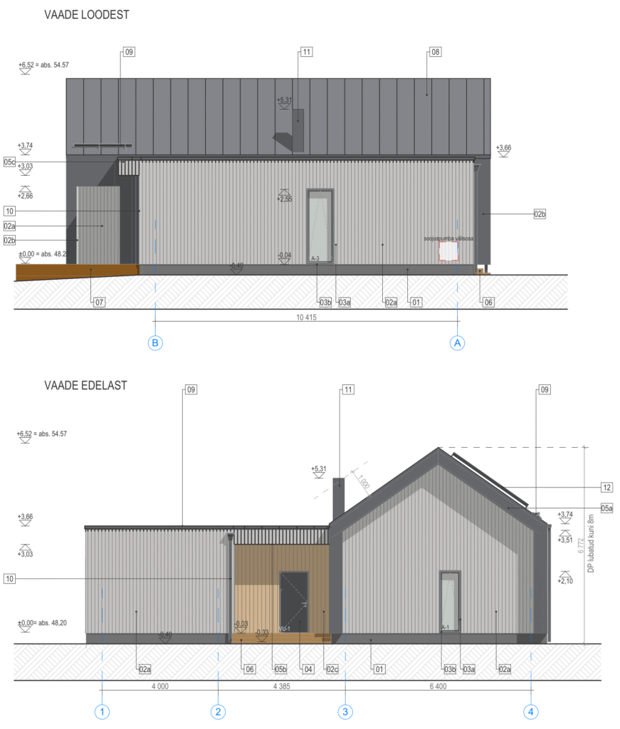 Välisviimistluse materjalide valikul on kombineeritud puit-, plekkfassaadi ning väheses mahus ka komposiitplaati. Toonide juures on lähtutud neutraalsetest toonidest (tumehall plekk, hele beež puit ning valge või helehall kivi mustriga komposiitplaat).